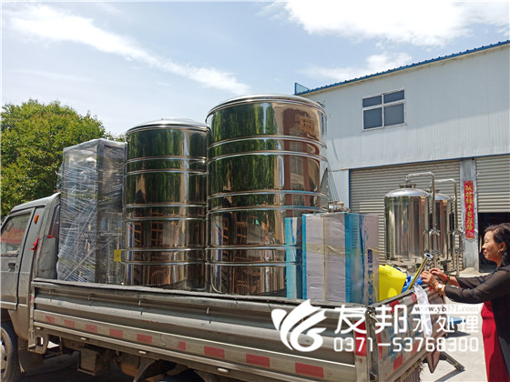 原水箱→增压泵→多介质过滤器→活性炭过滤器→增压泵→一超滤→中间水箱→臭氧灭菌→成品水箱→增压泵→微孔过滤器→灌装