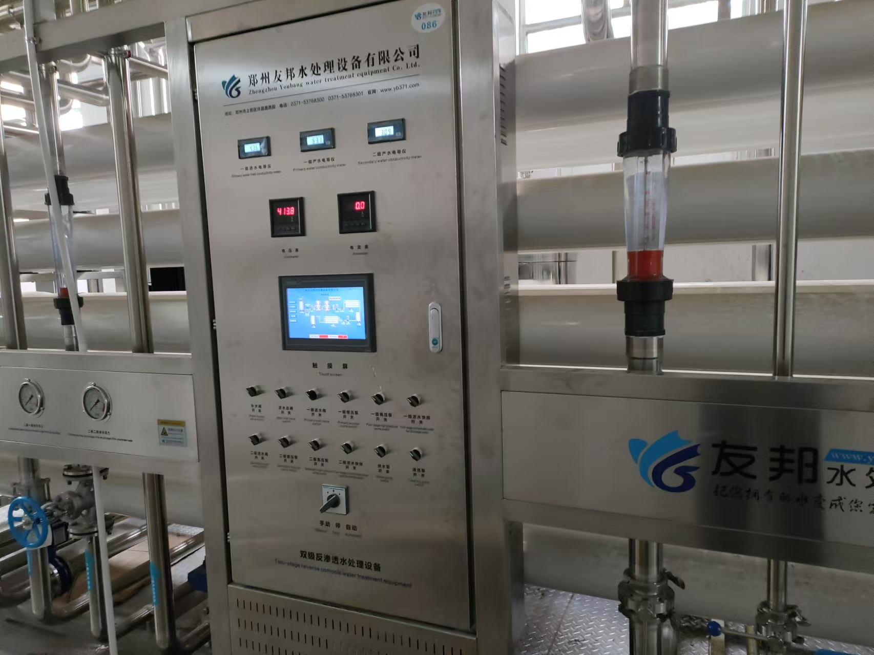 设置手动、自动操作,可实现原水泵、高压泵、纯水泵的自动控制。自动开停机、自动冲洗、无水停机、高低