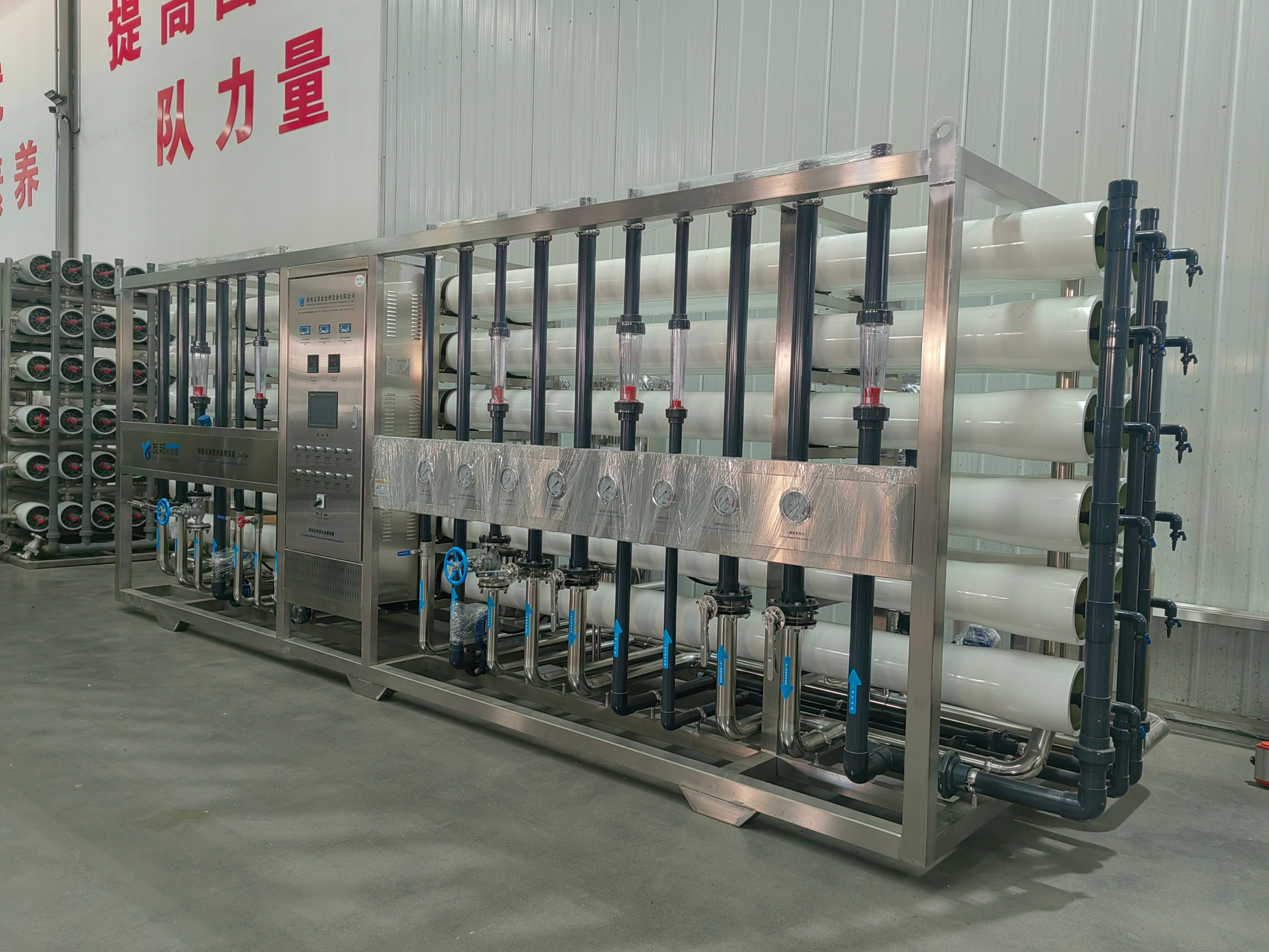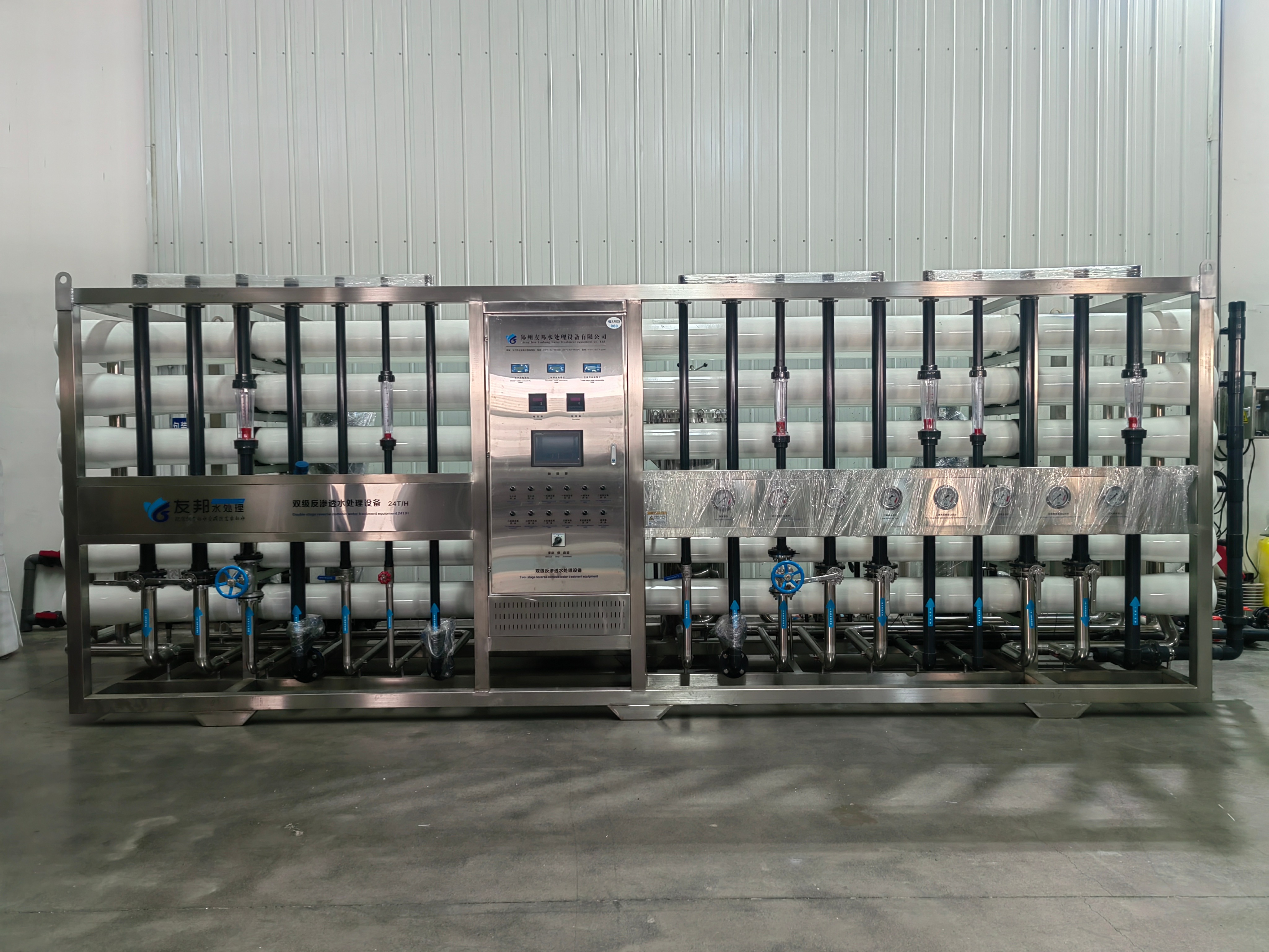预处理系统:包括原水泵、多介质过滤器、活性炭过滤器、软化器、保安过滤器等。原水泵用于将原水输送至预处理系统;多介质过滤器去除水中的大颗粒杂质和悬浮物;活性炭过滤器吸附有机物、余氯等;软化器降低水的硬度;保安过滤器进一步去除微小颗粒,保护后续的反渗透膜。