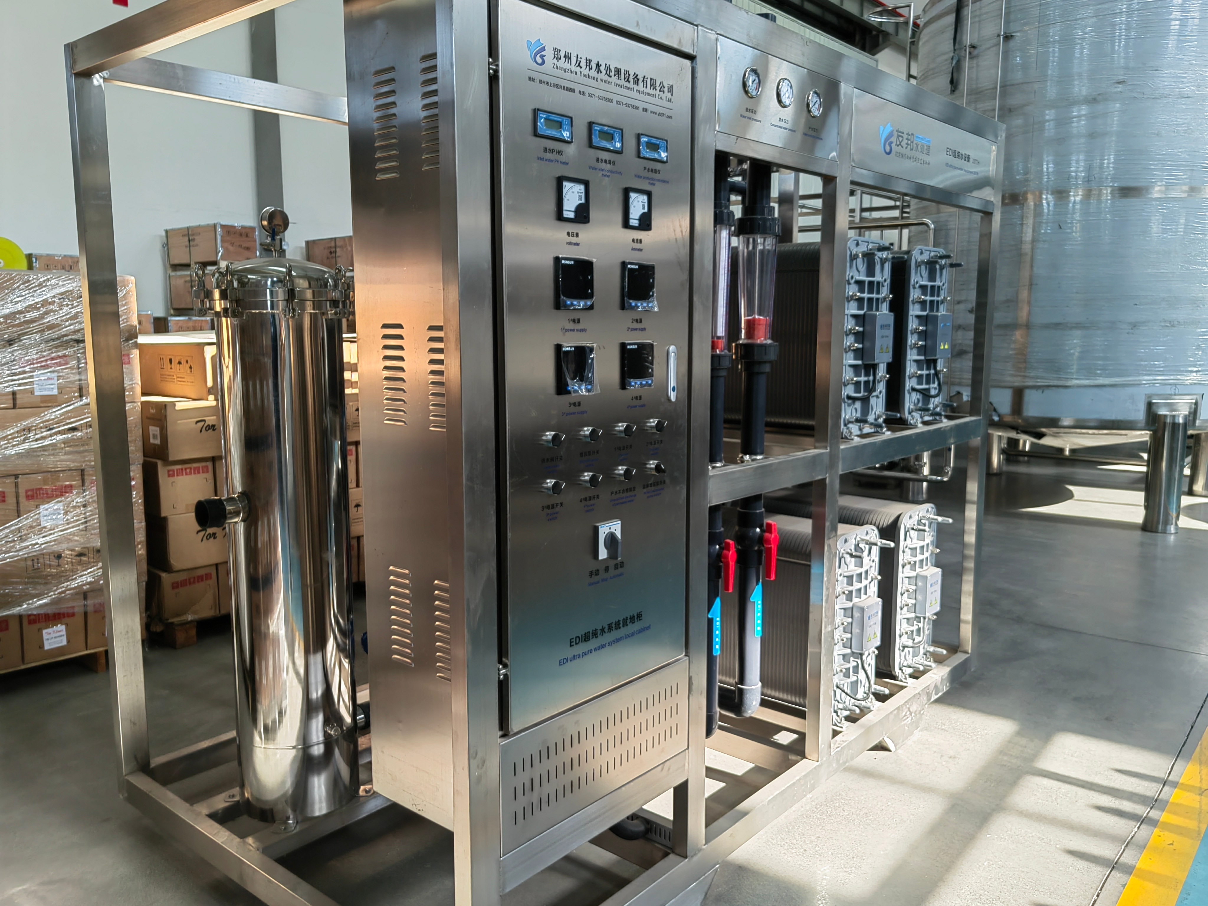 电去离子系统(EDI):由 EDI 模块、电源装置、浓水循环装置等组成。EDI 模块是电去离子系统的核心部件,实现水的深度脱盐;电源装置为 EDI 模块提供直流电源;浓水循环装置用于循环浓水,提高水的回收率。