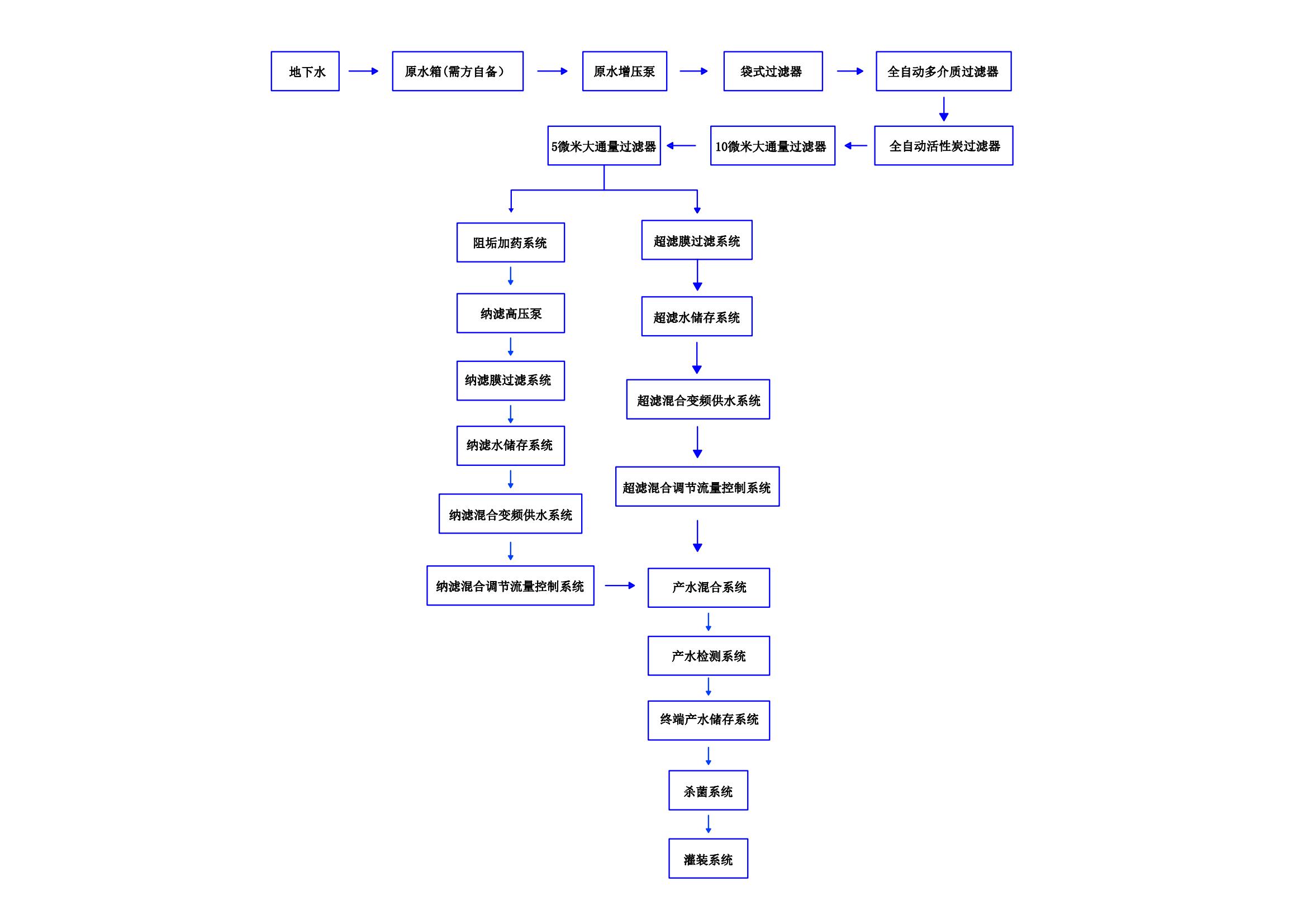 增压泵用来提升系统供水压力;多介质过滤器可清除水中的悬浮物、杂质等;活性炭过滤器可清除水中余氯、异味物质和异味气体,改善口感;精密过滤器进一步去除水中杂质,纳滤原件可将水中杂质、胶体、酚类化合物、氯化物、细菌等各种有害物质清除掉,并将水中有益的各类矿物质保留在水中。
