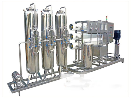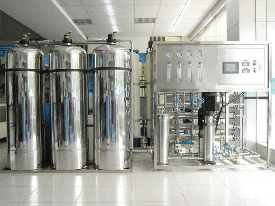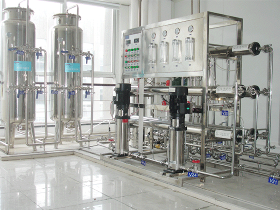 2.原水→原水增压泵→多介质过滤器→活性炭过滤器→软水器→精密过滤器→反渗透系统→中间水箱→中间水泵→EDI系统→纯化水箱→纯水泵→杀菌消毒→微孔过滤器→用水点