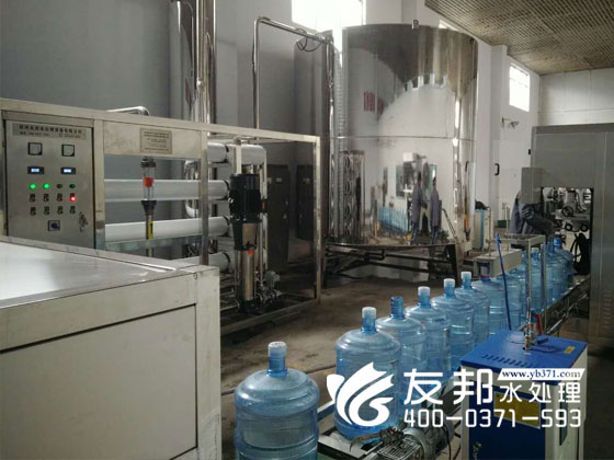 源水箱→源水增压泵→多介质过滤器→活性碳过滤器→阳树脂软化器→精密过滤器→一级RO反渗透纯水系统→二级RO反渗透纯水系统→水气混合器→不锈钢纯水罐→ 全自动灌装线。